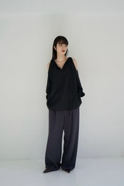 肩に丸く空いたデザインで抜け感があり、