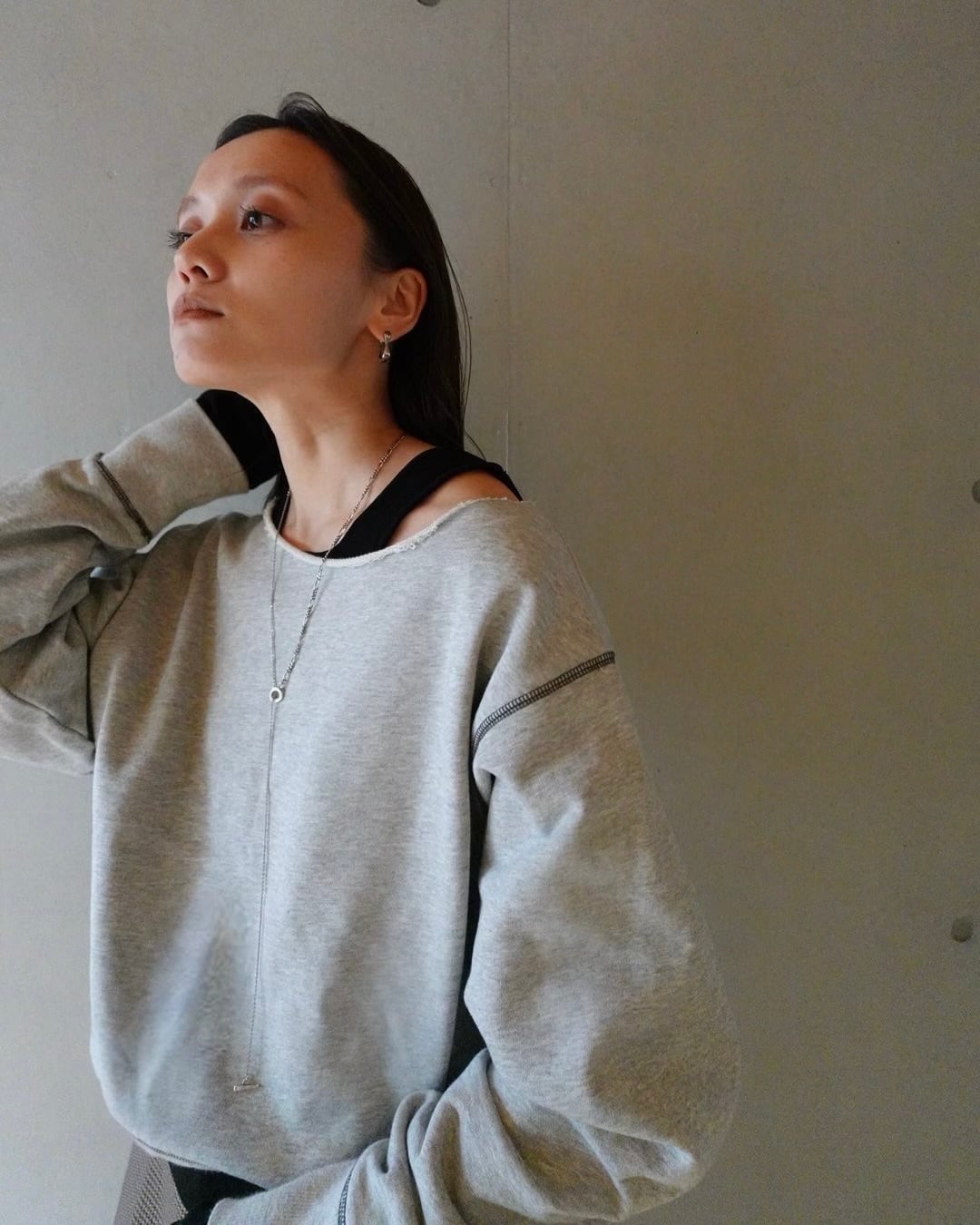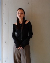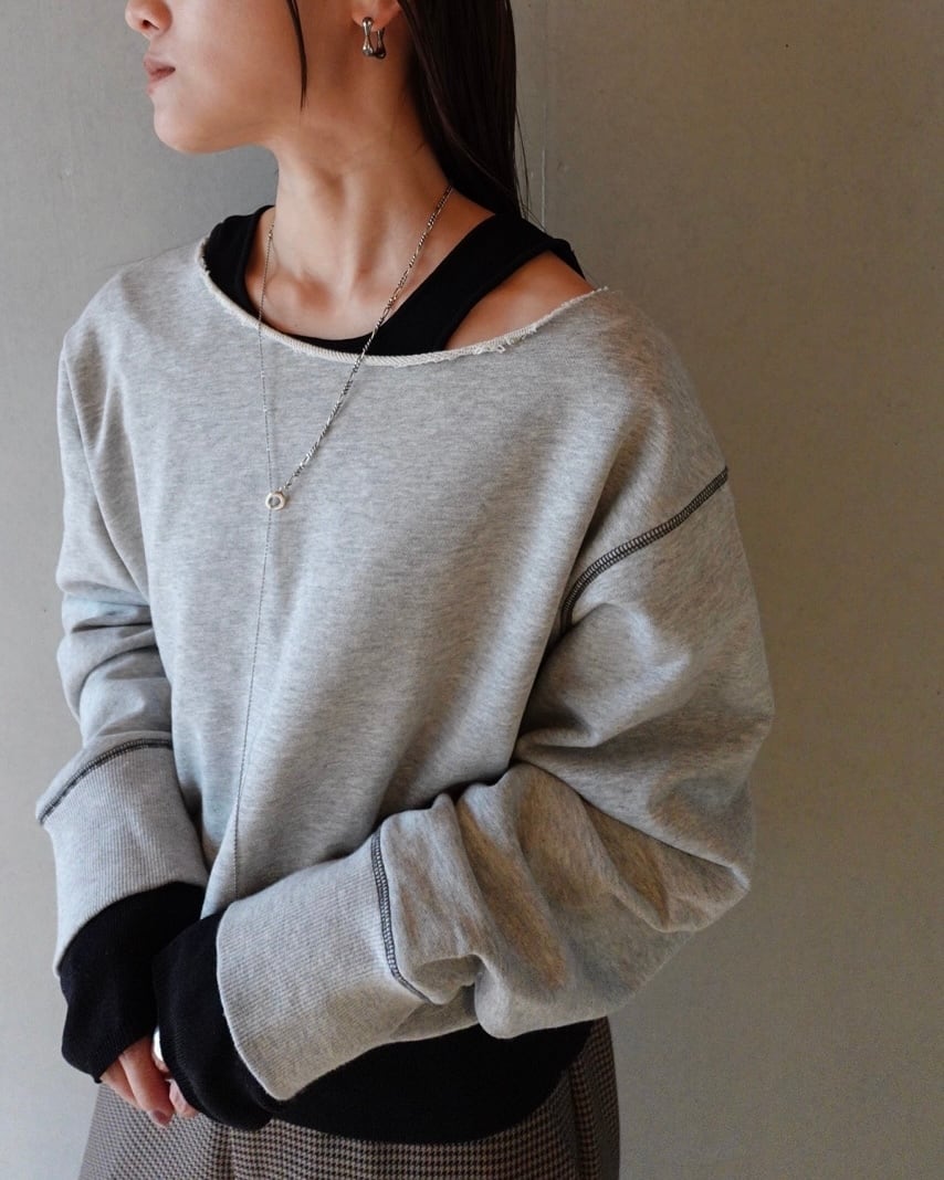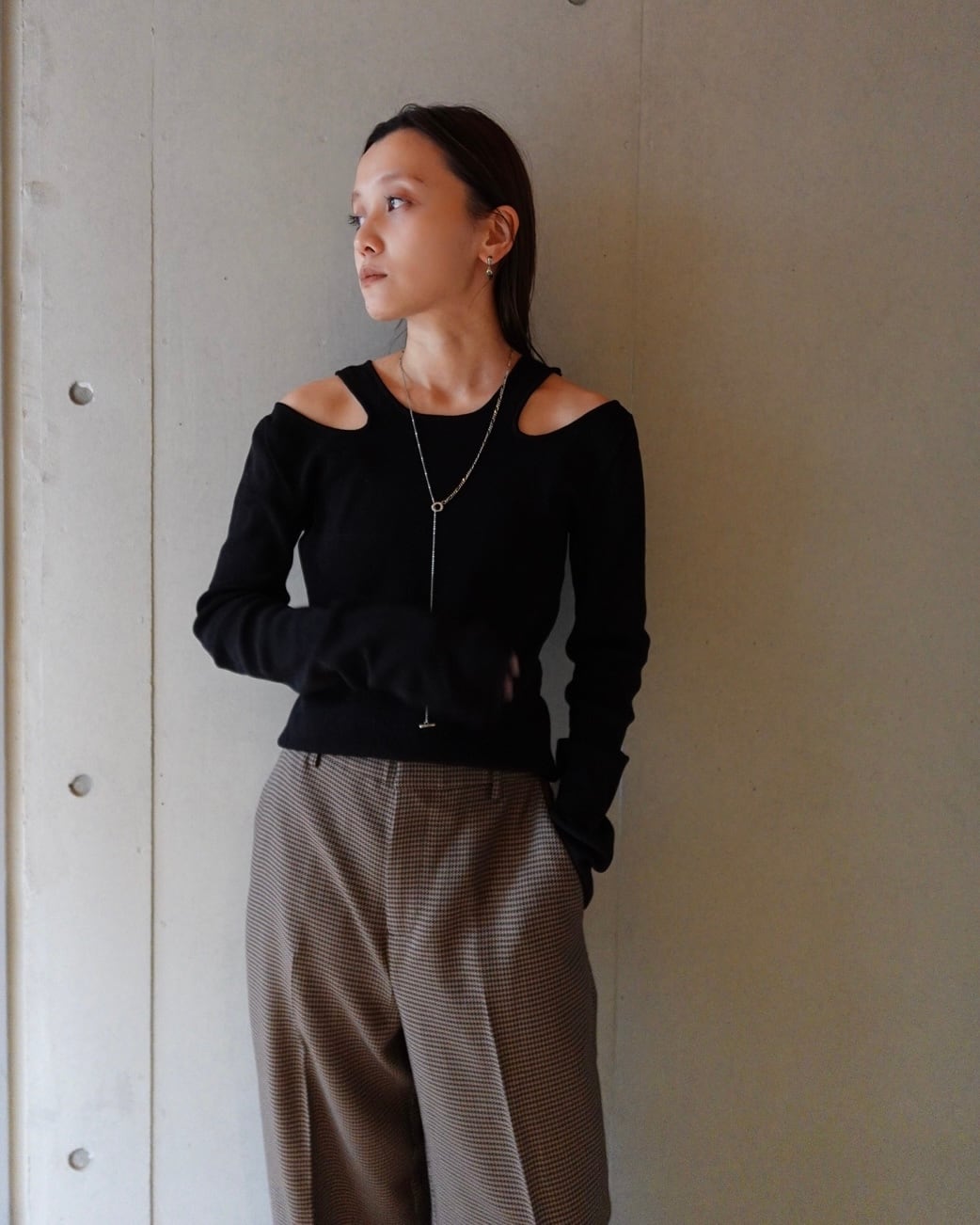 バックスタイルにもさりげないカッティングを施し、どの角度から見てもシンプルながら一枚でスタイリングが完成するアイテムです。