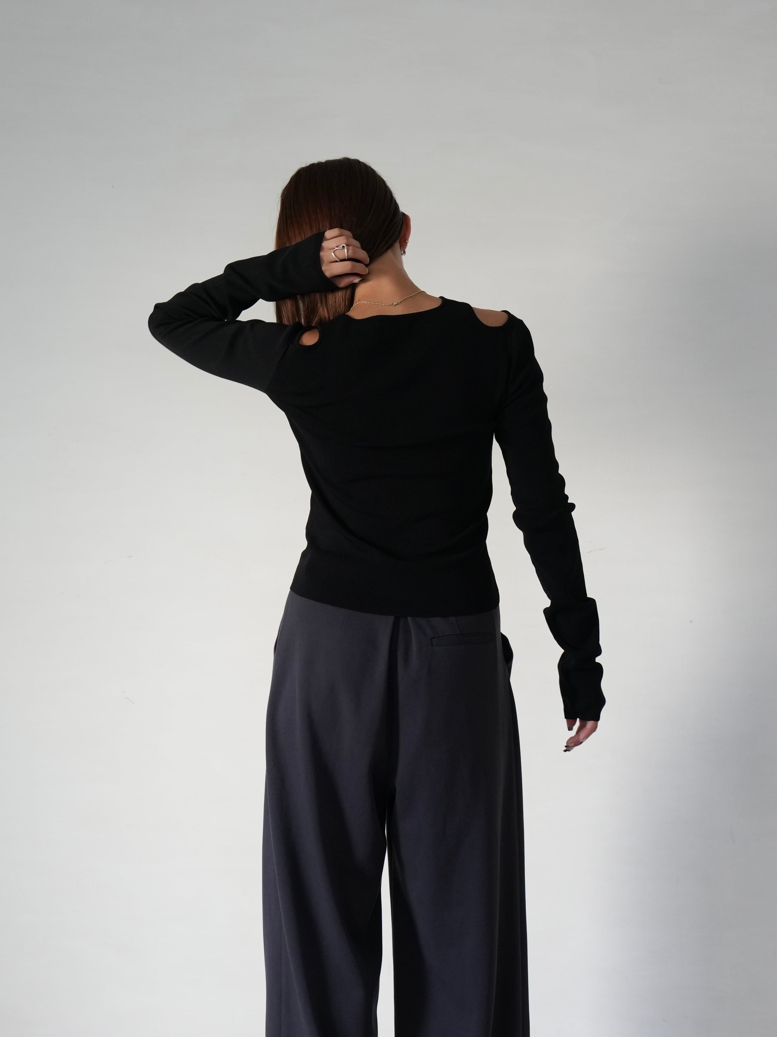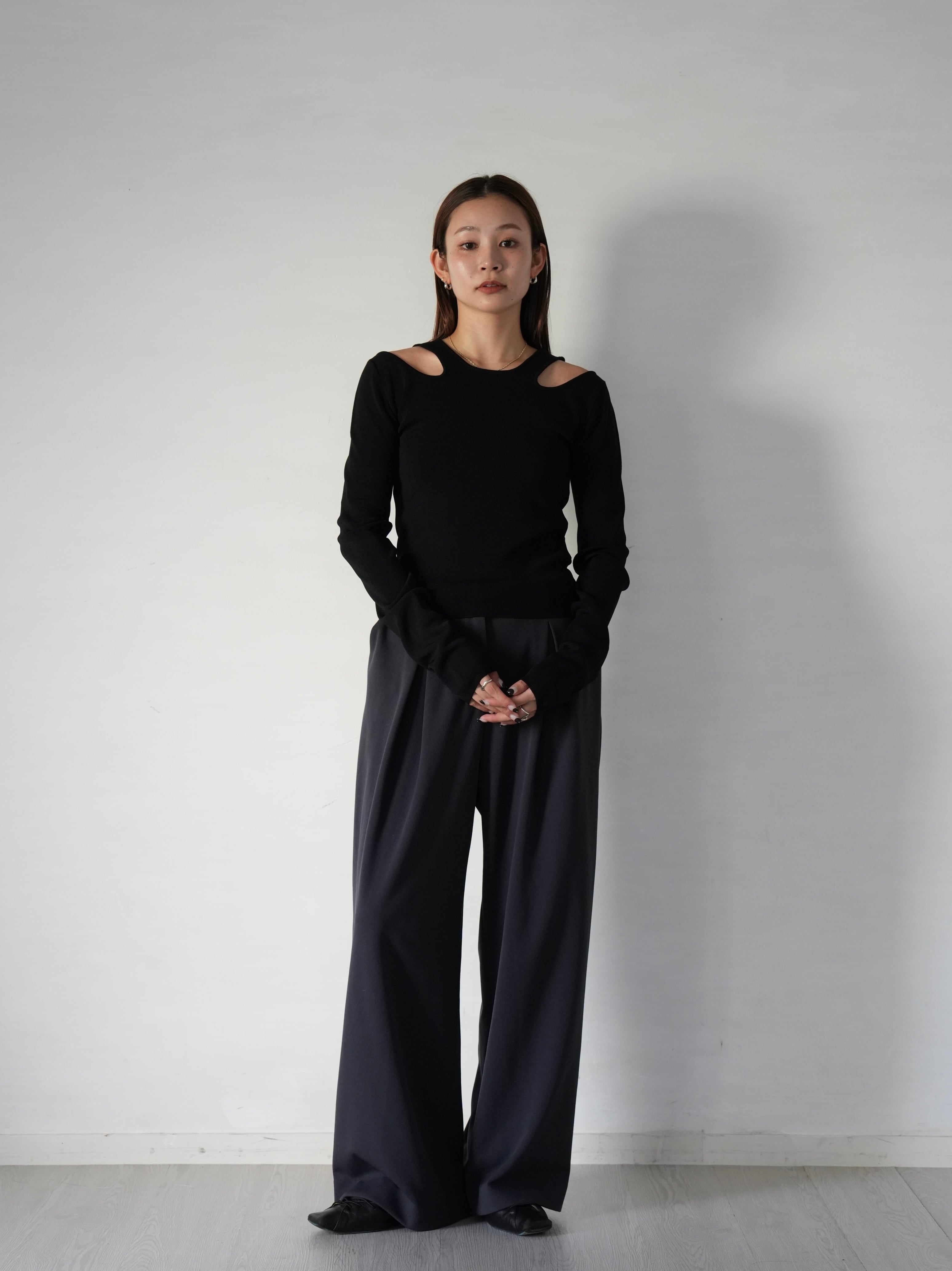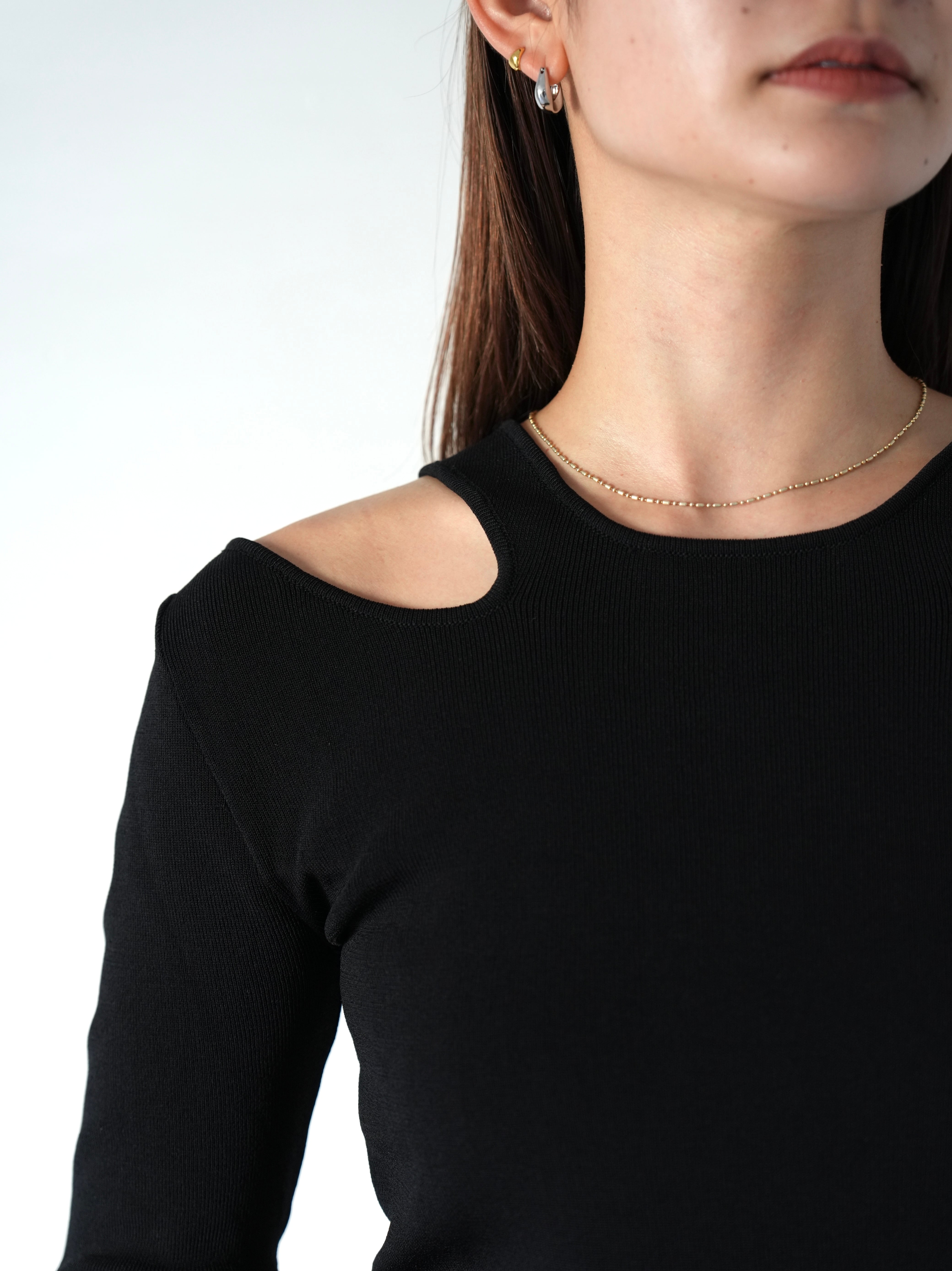 バックスタイルにもさりげないカッティングを施し、どの角度から見てもシンプルながら一枚でスタイリングが完成するアイテムです。