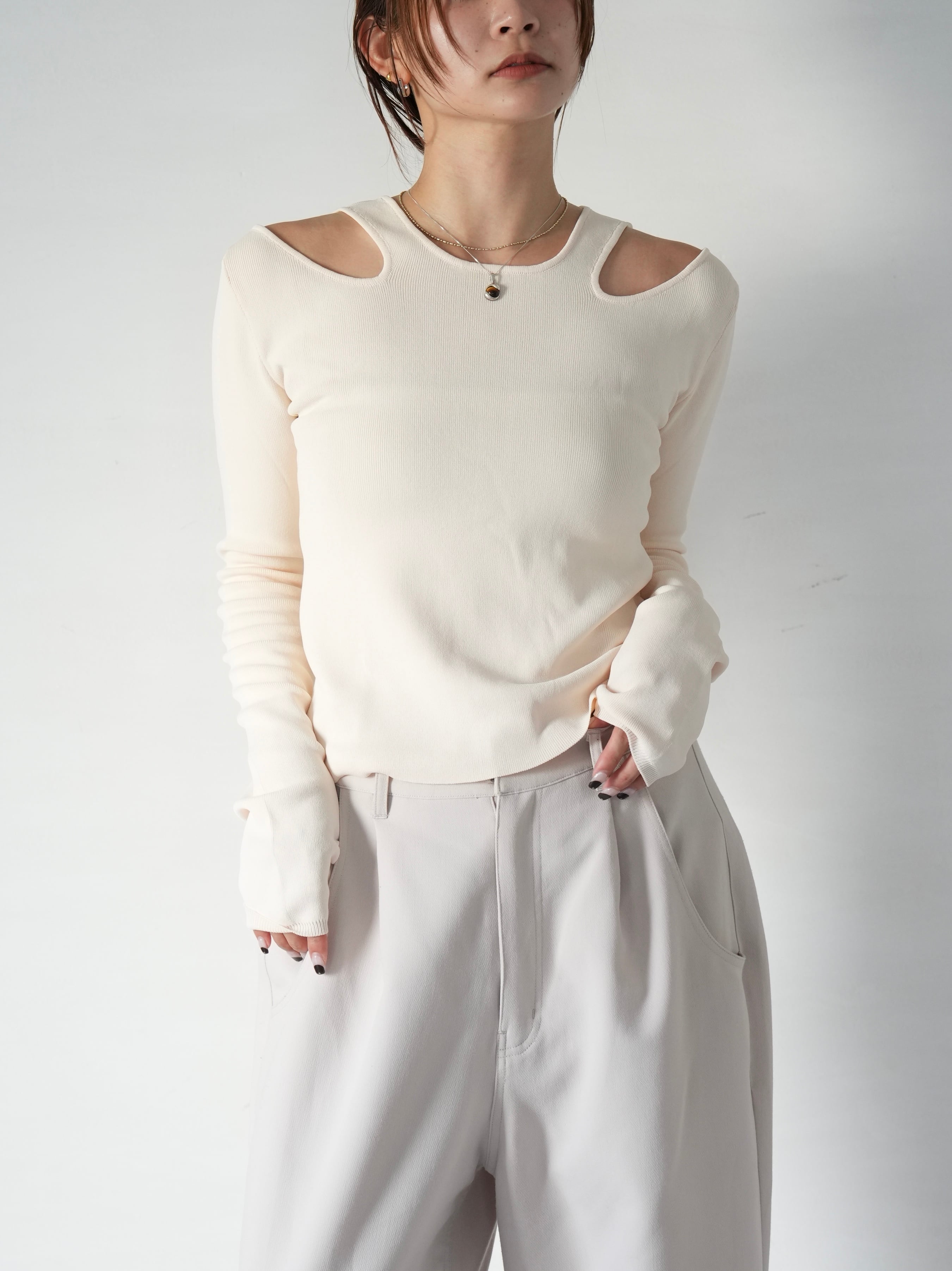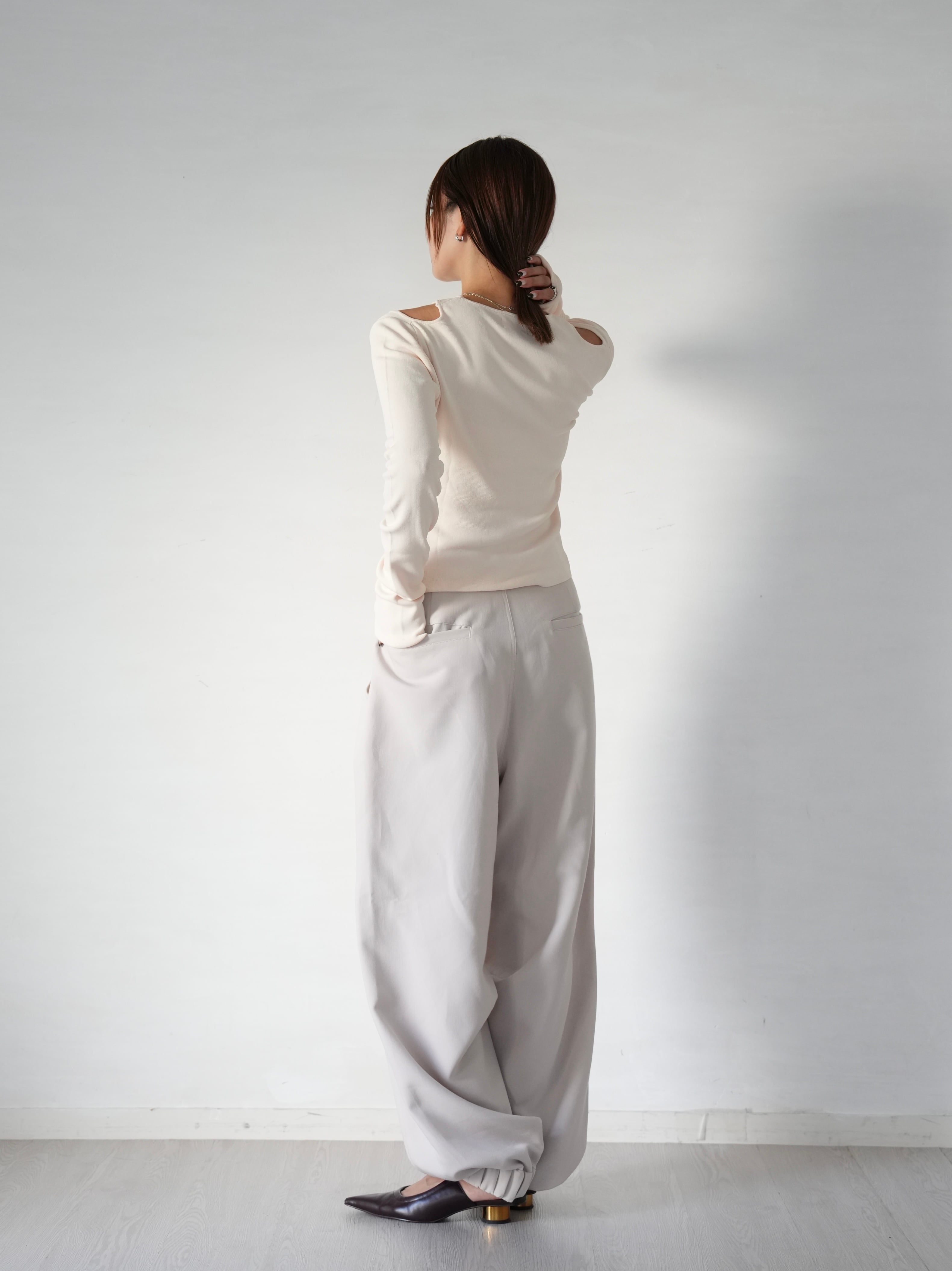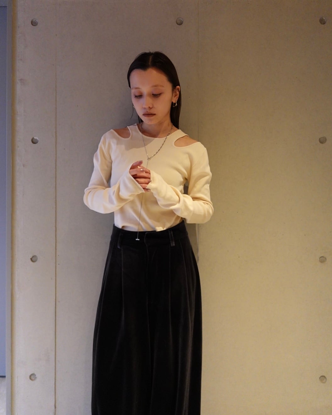 バックスタイルにもさりげないカッティングを施し、どの角度から見てもシンプルながら一枚でスタイリングが完成するアイテムです。