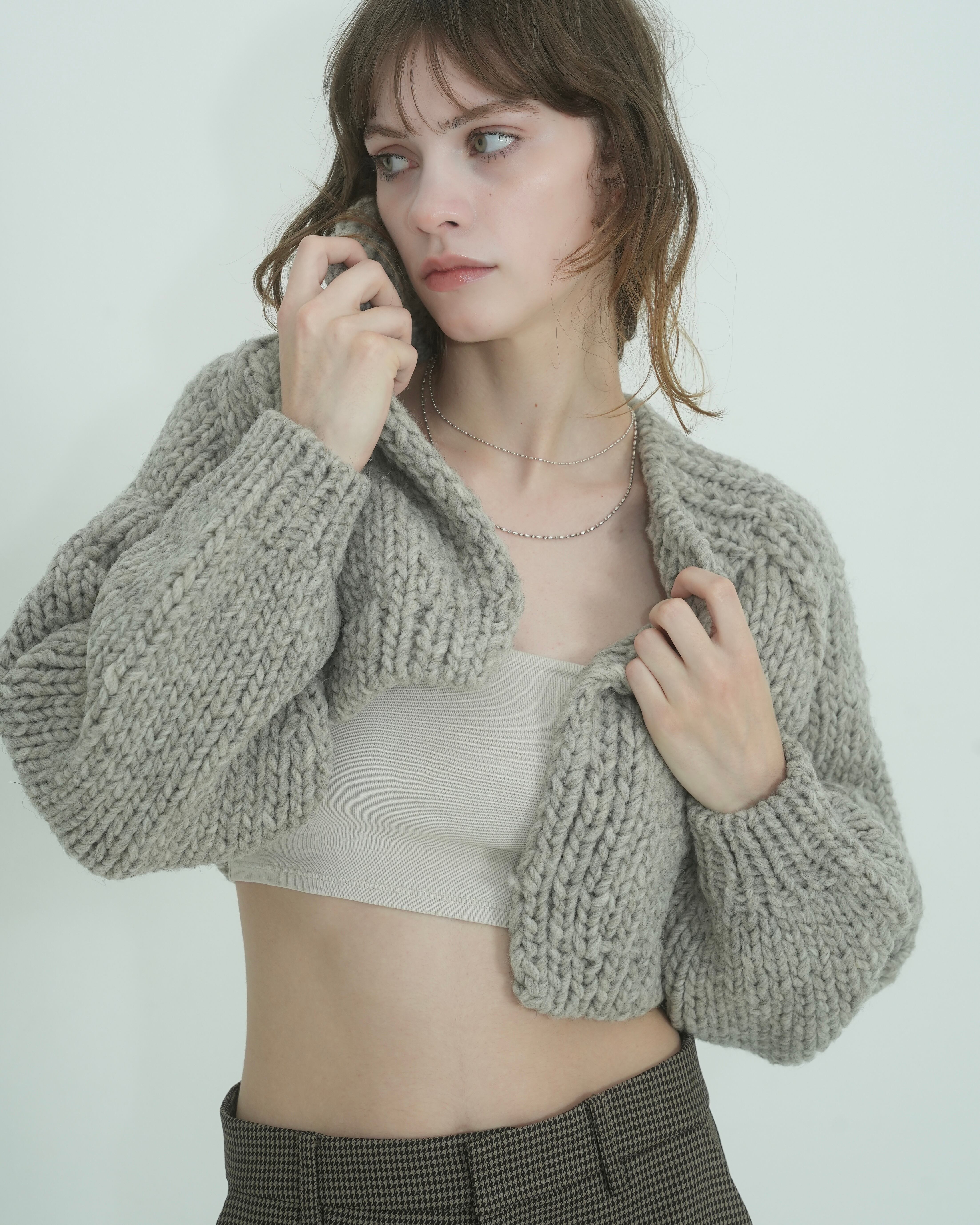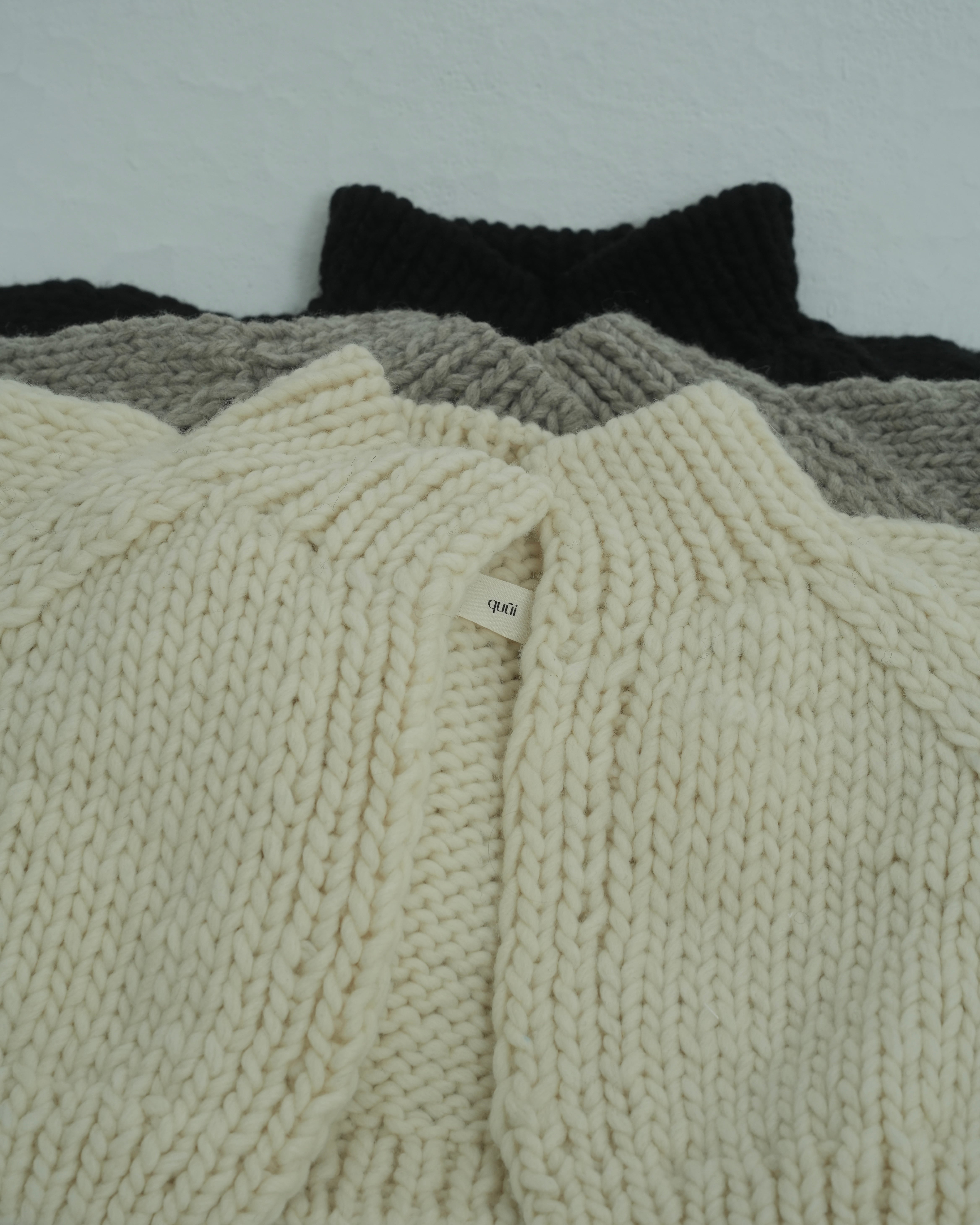 ローゲージのざっくりとした編み地に、端のキュッと詰まった編みがアクセント。