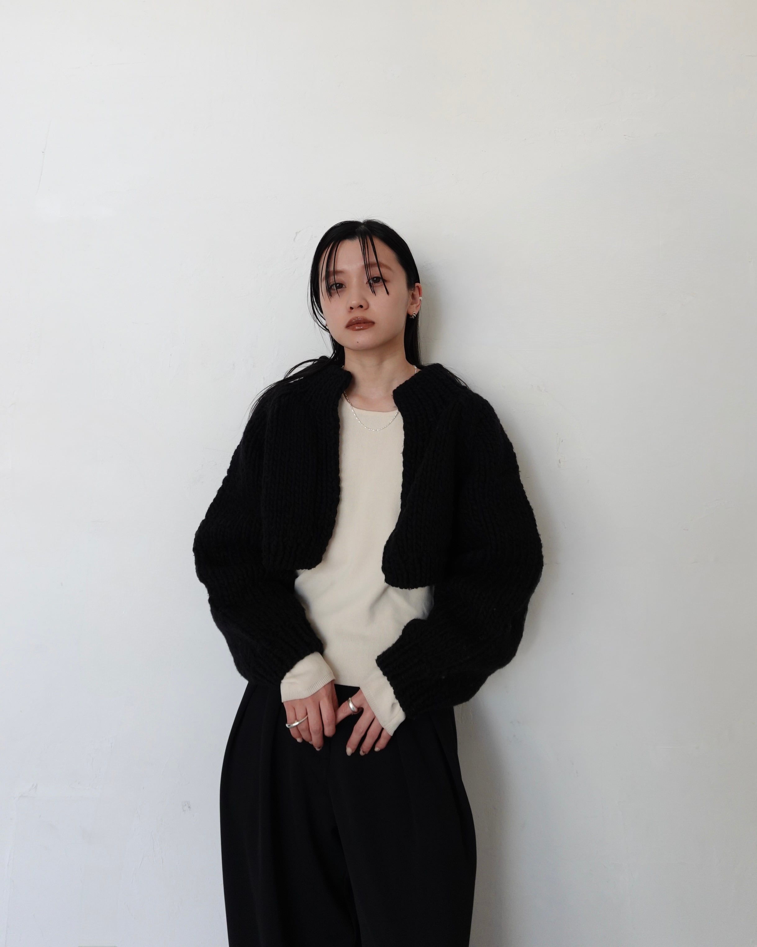 ローゲージのざっくりとした編み地に、端のキュッと詰まった編みがアクセント。
