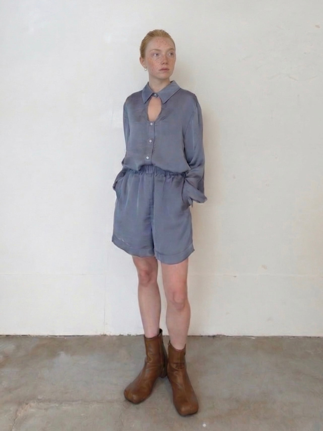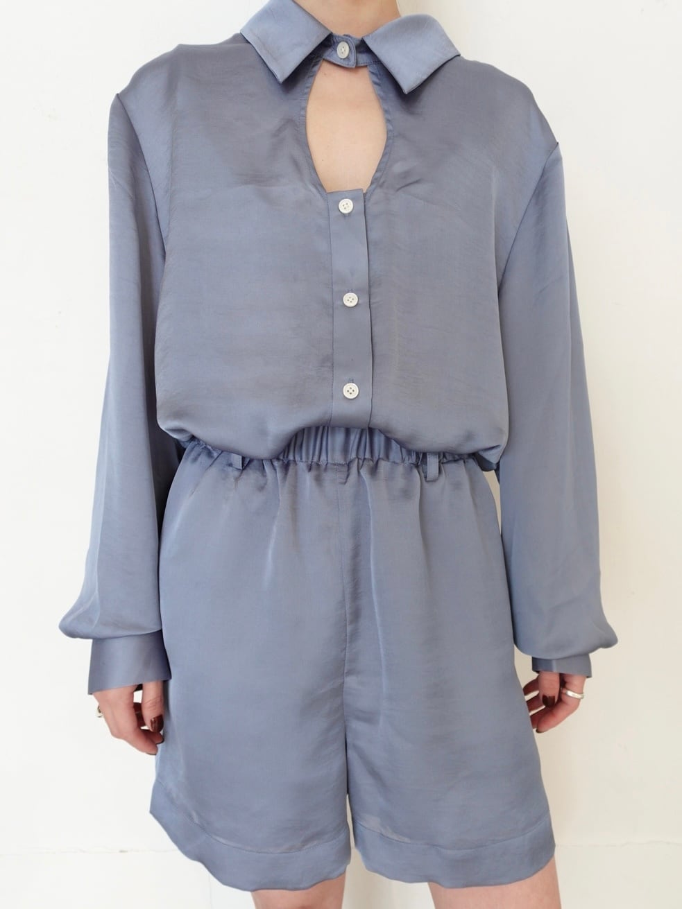 生地には「satin bustier set shirts」と同素材の、ヴィンテージ加工を施した大人のためのシックな生地を使用。繊細なニュアンスのある質感が、ラフになりすぎず、こなれ感を演出します。